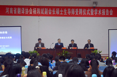 10月22日上午,河南省翻译协会杨玮斌副会长硕士生导师受聘仪式暨学术报告会在人文楼报告厅隆重举行。受聘仪式和学术报告会均由beat365在线体育官网登录入口刘世理院长主持,我校副校长李俊,国际交流处处长武津刚等校领导以及beat365在线体育官网登录入口三百余名师生参加了受聘仪式。李俊副校长宣读了聘杨玮斌教授为beat365在线体育官网登录入口硕士生导师决定,并向杨玮斌教授颁发了受聘证书。