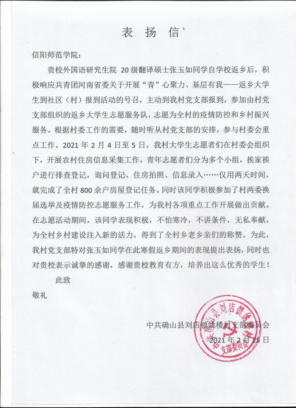 表扬信来自于驻马店确山县刘店镇姚楼村党支部。从表扬信中得知,2021年2月4日至5日,该村党支部响应共青团河南省委号召,开展“‘青心聚力、基层有我’”活动。活动中,张玉如随其他志愿者一同下乡服务,始终保持24小时待命状态,帮助村民完成线上农村住房信息采集表的填写,认真开展入户摸排,做到了底子清、情况明、数字准,不漏一户一人。