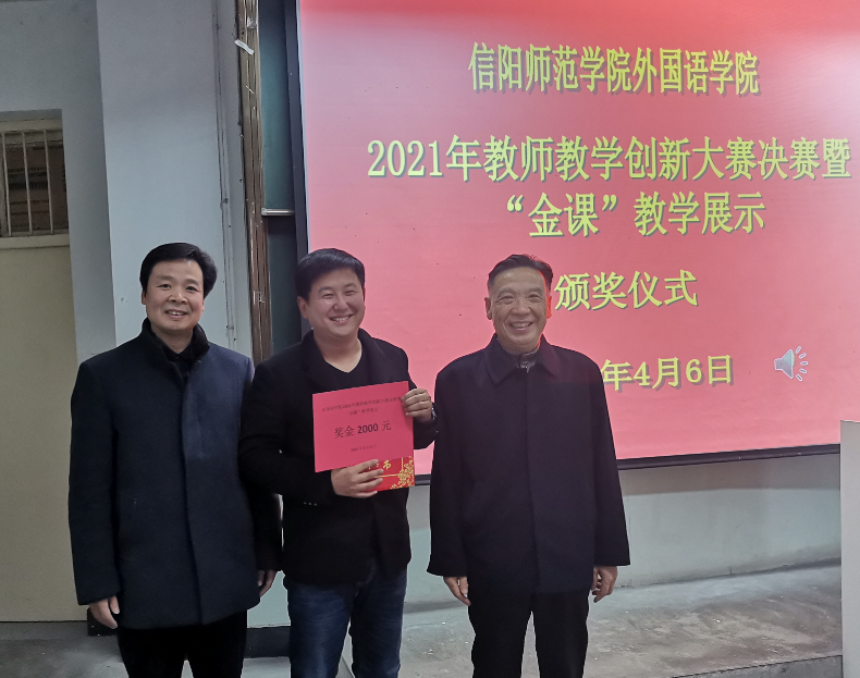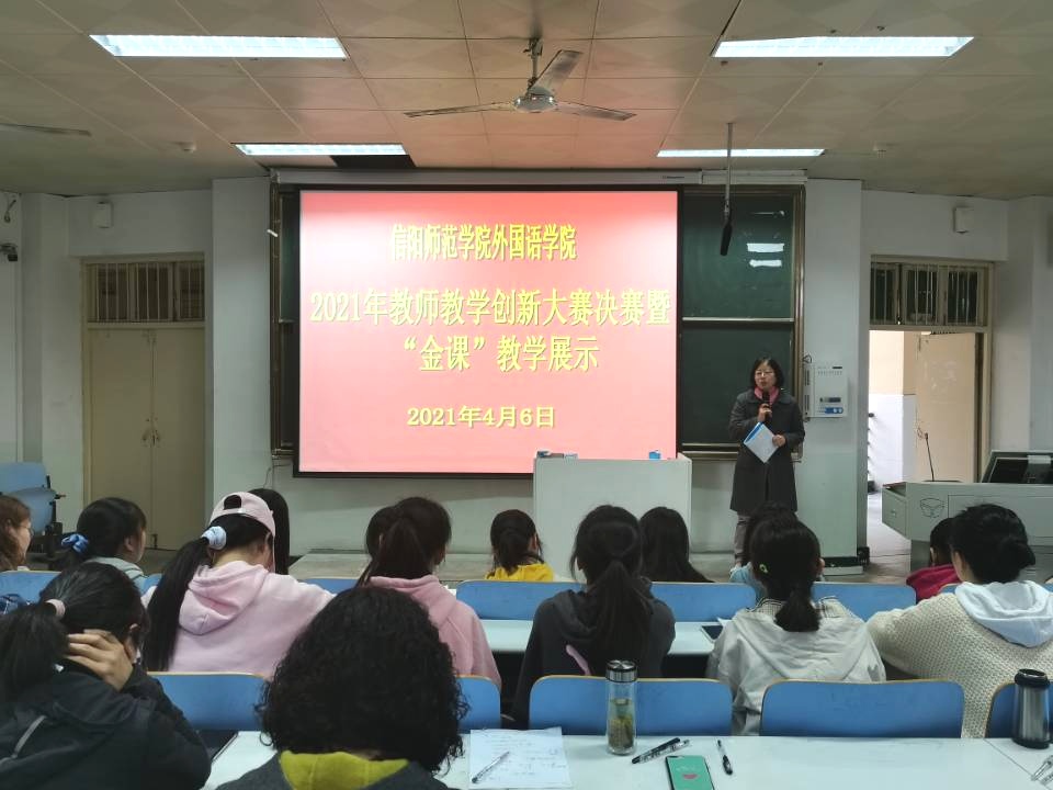 4月6日下午,beat365在线体育官网登录入口在人文楼308教室成功举办2021年教师教学创新大赛决赛暨“金课”教学展示活动。学院党委书记周学红,院长蔡满园,党委副书记柏孟仁,副院长姚光金,评委余运伟,李明晔,陈顺黎,傅翀,宣军磊,刘海军,任芳、教务办老师们参与此次活动。全体专任教师和部分英语专业学生观摩了比赛。