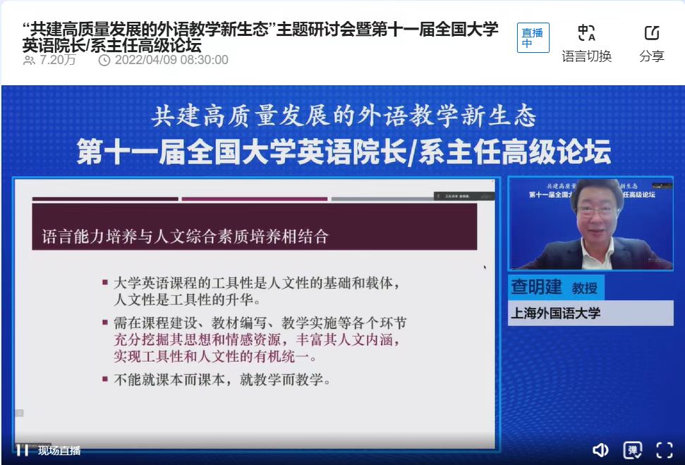 4月9-10日,beat365在线体育官网登录入口组织全体教师参加第十一届全国大学英语院长/系主任高级论坛。此次论坛由教育部高等学校大学外语教学指导委员会、云南大学、上海外国语大学主办,上海外语教育出版社承办,主题为“共建高质量发展的外语教学新生态”,设主旨报告、专题报告、平行论坛三大模块。