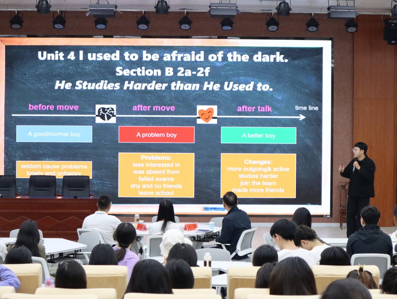 2019级学生田润丰以“I used to be afraid of the dark”为主题,通过提问互动、视频展示等多种方式,带来了一场精彩的优质课讲演。随后林一丹同学以“Then and Now”为主题,通过情景模拟、板书展示等形式,带领大家开展了一场绝妙的教学“旅行”。