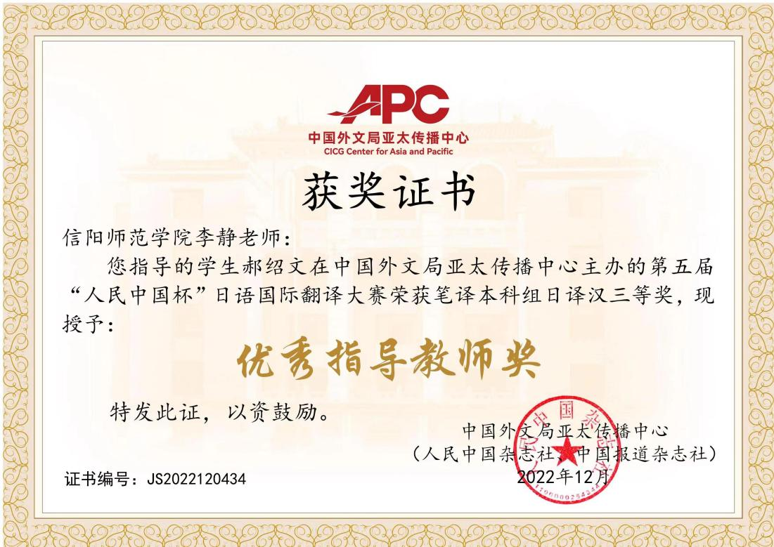 近日,2022年第五届“人民中国杯”日语国际翻译大赛获奖名单公布,我院2020级日语2班郝绍文在笔译本科组日译汉中荣获三等奖,李静(博士)荣获优秀指导教师奖。