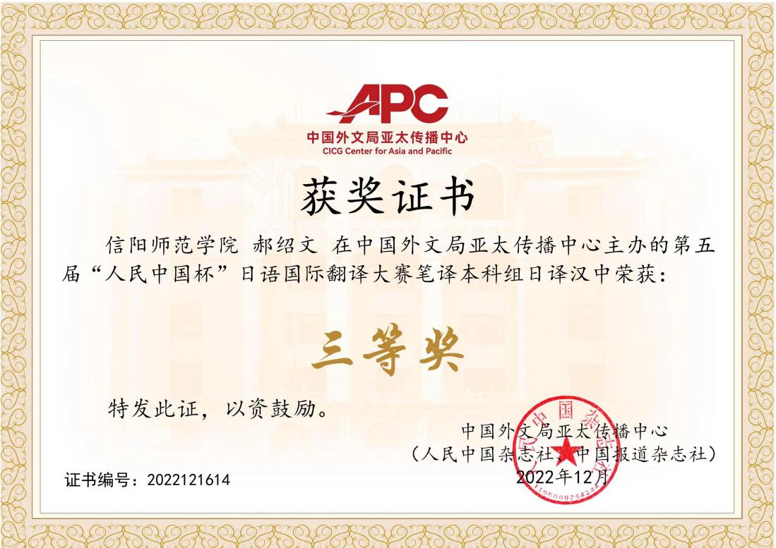 据悉,“人民中国杯”日语国际翻译大赛是日语界覆盖面最广、赛制层次最全、参赛人数最多的专业赛事之一,由中国外文局亚太传播中心(人民中国杂志社、中国报道杂志社)主办,旨在进一步加强中日文化交流与合作,鼓励用外语讲述中国故事,在国际舞台传播中国声音,并推动高层次、实践型、应用型日语翻译人才培养,致力于为两国翻译爱好者搭建交流的桥梁,为促进中日翻译事业的发展贡献力量。2022年第五届“人民中国杯”日语国际翻译大赛吸引了近万名选手参加,我院学子郝绍文在比赛中的优异表现,是对学习成果的一次真实检验,也是我院人才培养质量的重要体现。