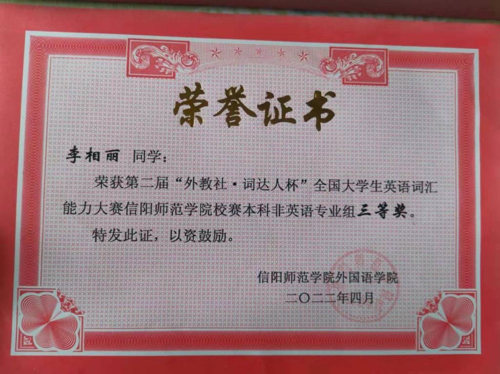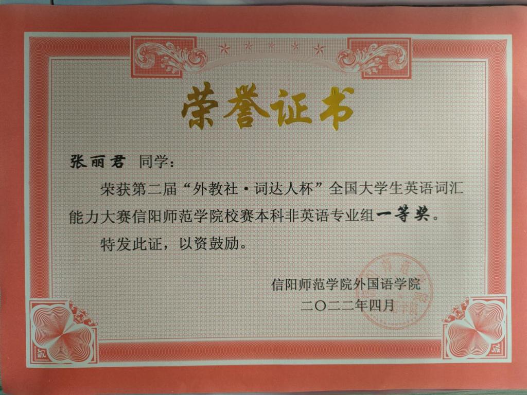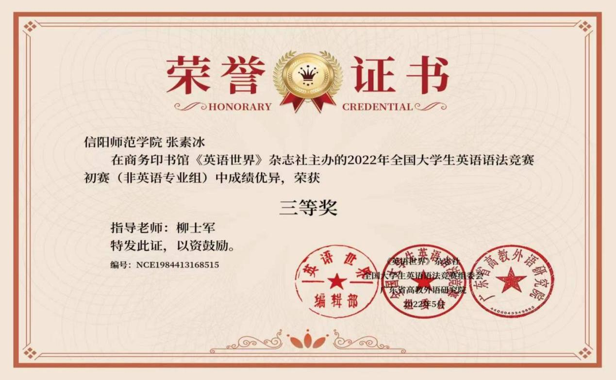 五、此前,由蔡威副教授指导的学生收到2021年“外研社 国才杯”全国英语阅读大赛,获得河南赛区一等奖,证书如下: