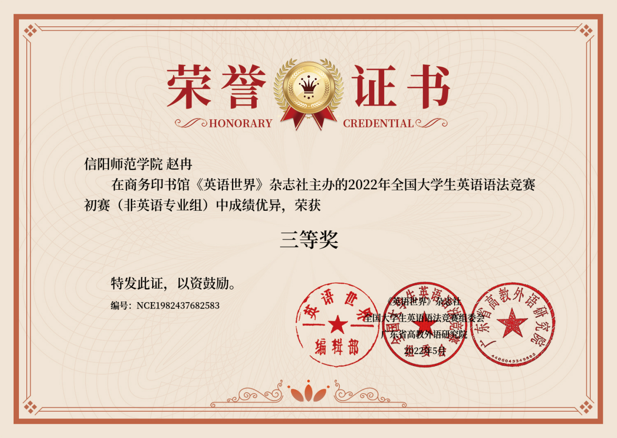 一、2022年全国大学生英语语法竞赛获奖成绩证书如下: