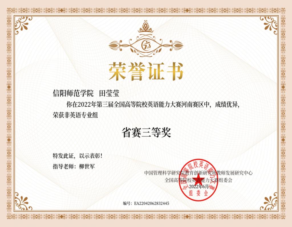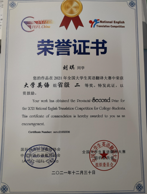 四、全国大学生英语翻译比赛获奖证书如下: