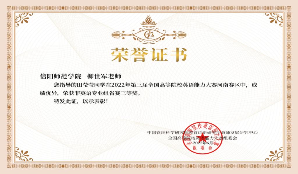 三、2022年第三届全国高等院校英语能力大赛定于2022年5月28日至5月29日举行,公共外语教研室老师指导学生获奖证书如下: