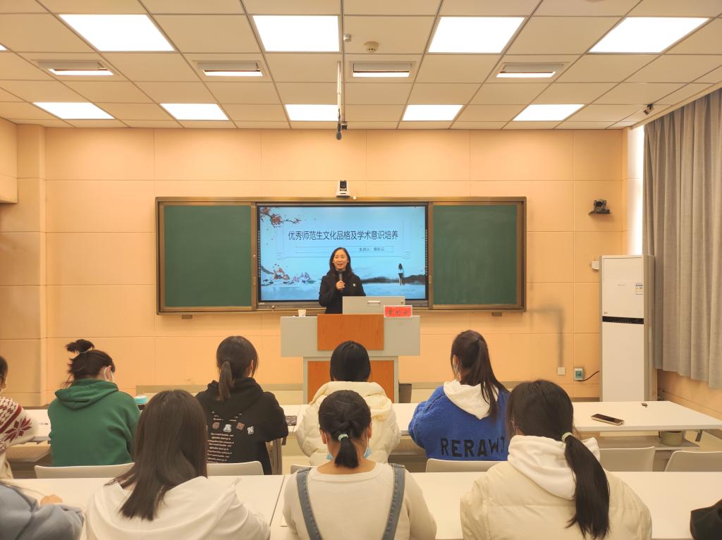 11月15日下午,beat365在线体育官网登录入口副院长章彩云教授在人文楼603教室作了题为《优秀师范生文化品格及学术意识培养》的新生入学教育专题报告,学院2022级全体新生参加了报告会,报告会以线下与线上相结合的方式进行。