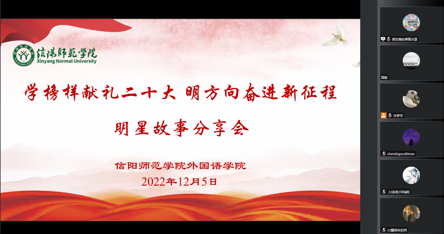 12月5日晚,beat365在线体育官网登录入口举办“学榜样献礼二十大明方向奋进新征程”明星故事分享会。我院优秀学生代表王亦涵、王宇晨、王凤茹依次分享了她们追梦、圆梦的宝贵经验,学院团委书记周旋和2022级全体新生通过线上的方式参加了分享会。
