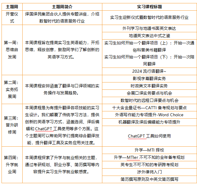 译国译民集团是翻译、培训、图书出版、校企合作多业务并行发展的综合型公司,也是中国翻泽协会理事单位、全球百强语言服务商、全国翻译专业学位研究生教育实习基地,旗下拥有译国译民翻译、译国译民教育、问才教育、译语康、必睿国际等核心子品牌。此次寒假线上实习项目自2024年1月8日持续到2024年3月10日,分两期进行,两期培训内容相同,每期的实习时间都为四~八周。第一期四周实习时间为2024年1月8日至2024年2月4日。第二期四周实习时间为2024年1月24日至2月25日。
