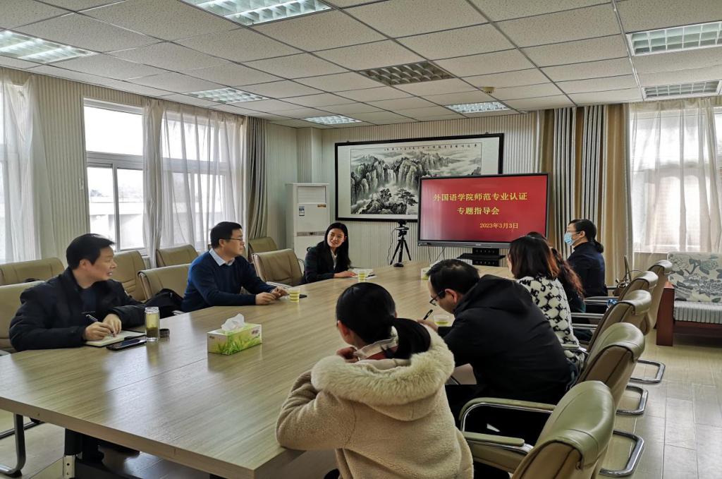 会议由副院长郭敏主持,郭敏首先对刘国兵院长的到来表示欢迎,并汇报了我院英语师范专业认证工作的进展情况。随后,刘国兵院长结合河南师范大学beat365在线体育官网登录入口参加师范专业认证的情况,从理念到实践的视角对我院师范专业认证工作进行了细致入微的指导,刘国兵指出师范类专业认证的三大任务及其重点考察的“五个度”,强调“持续改进”的重要性。会上刘国兵还结合自身工作实际,对与会教师提出的师范专业认证方面的疑问进行了详尽的解答,并就目前存在的主要问题交换意见。