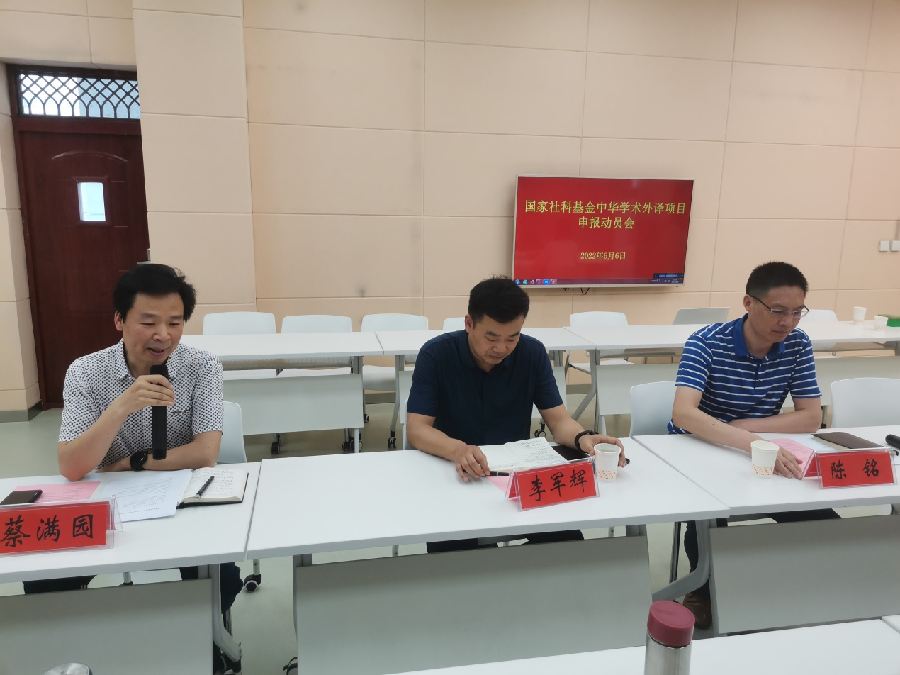 6月6日下午,beat365在线体育官网登录入口在人文楼603室召开了国家社科基金中华学术外译项目申报动员会,社科处处长李军辉,beat365在线体育官网登录入口党委书记陈铭,院长蔡满园,副院长郭敏,beat365在线体育官网登录入口全体博士及部分文科院系留学归国人员参加了本次会议,蔡满园院长主持会议。