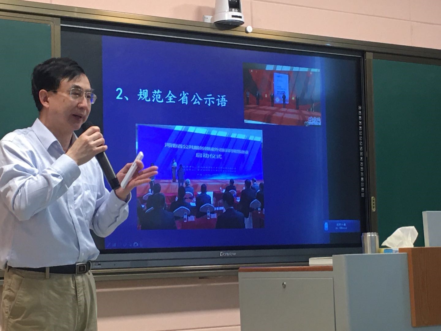 杨玮斌首先从河南省海外形象分析着手,指出我省在外宣翻译方面存在的问题,进而引出翻译河南,构建地方对外话语体系的必要性。他还结合国家、教育部和省教育厅对新文科建设的相关文件指出外语学科应改变传统文科建设的模式和地方特色结合,为塑造河南海外形象做出自己的贡献。最后杨玮斌向大家具体介绍了“翻译河南工程”的启动、进展及成效。