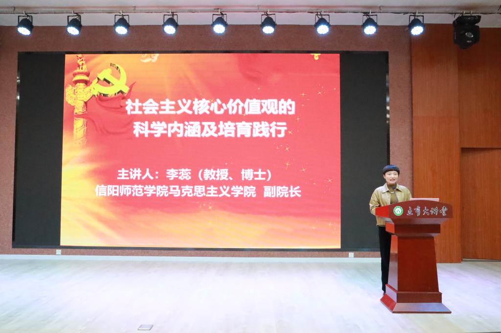 李蕊教授从社会主义核心价值观的提出过程、提出原因、科学内涵、培育践行等四个方面讲述了社会主义核心价值观的科学内涵及培育践行相关问题。她指出,深入学习、准确把握社会主义核心价值观的科学内涵具有重要意义,对推动广大青年学生做社会主义核心价值观的坚定信仰者、积极传播者和模范践行者具有重要指导作用。
